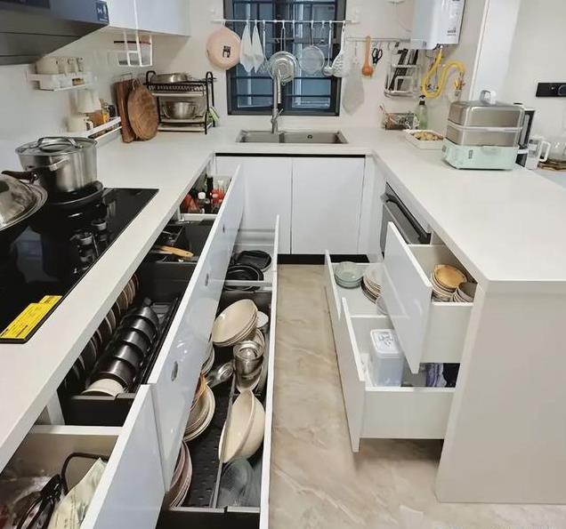 而抽屉式的橱柜就完全避免了这种情况,即使是放置大物品,也能轻松取用,大大提升了厨房空间利用率和物品可及性。