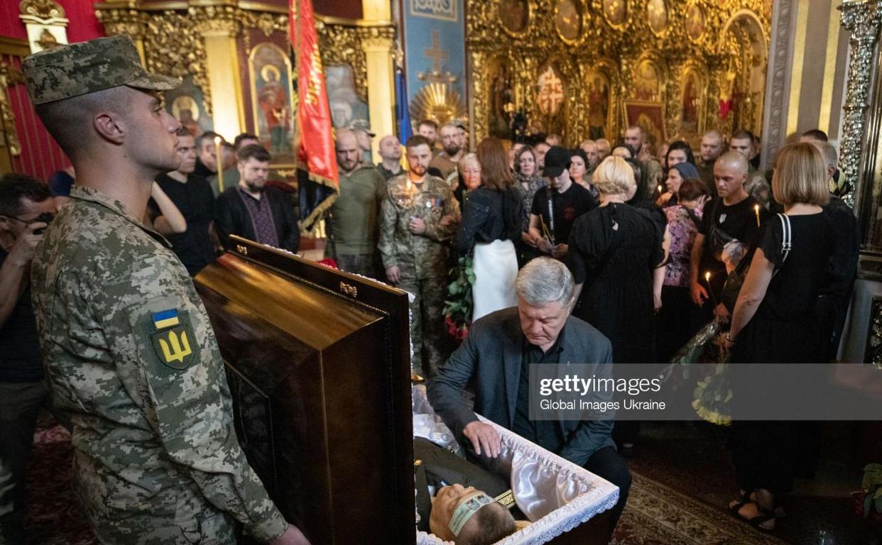 (波罗申科携妻子跪送谢尔希·伊尔尼茨基遗体,据悉,谢尔希·伊尔尼茨基将会安葬在基辅森林公墓内)