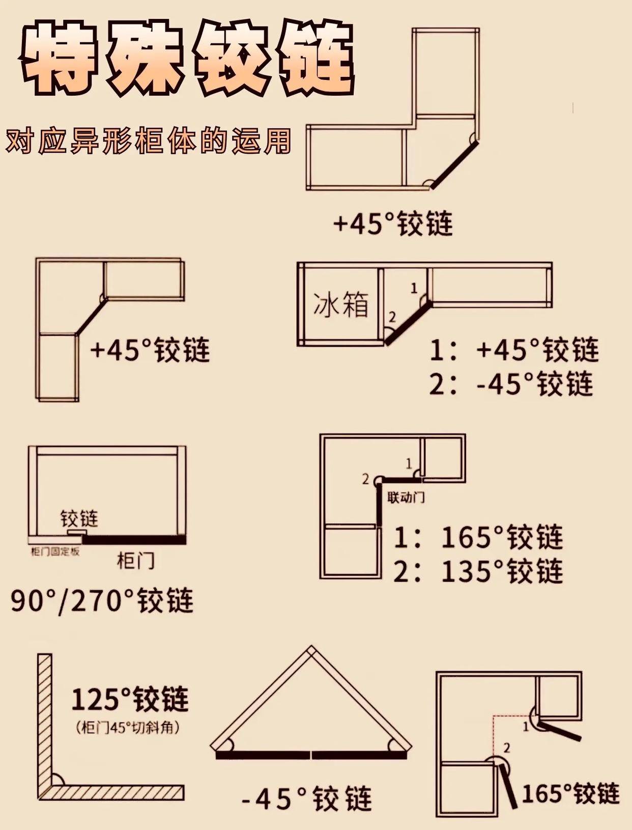 对于异形柜体,165°铰链和正45°铰链就派上了大用场。165°铰链适合侧板与柜门角度较大的柜体,比如斜角餐边柜、异形书柜,它能让柜门打开至165°,既不会遮挡柜体内部,也不会与旁边的柜门发生碰撞,兼顾实用与美观。而正45°铰链则多用于特殊造型的柜门,比如45°切斜角的门板、嵌入式展示柜,它能让柜门以45°角度开合,贴合异形柜体的设计,让整体造型更简洁流畅。