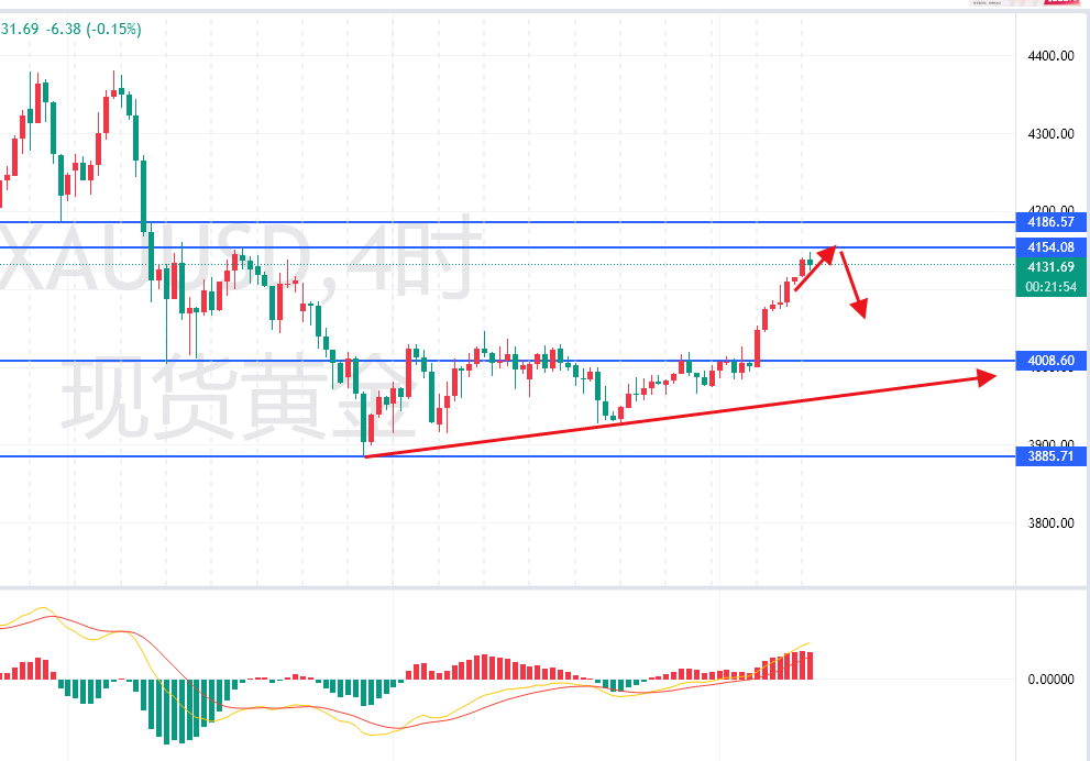 昨日至今晨,黄金出现近150美元的大幅拉升,午间则回落约20美元,目前位于4130附近,最低触及4125。国际黄金的优势在于其双向波动特性,只要顺应市场节奏,始终存在盈利机会。