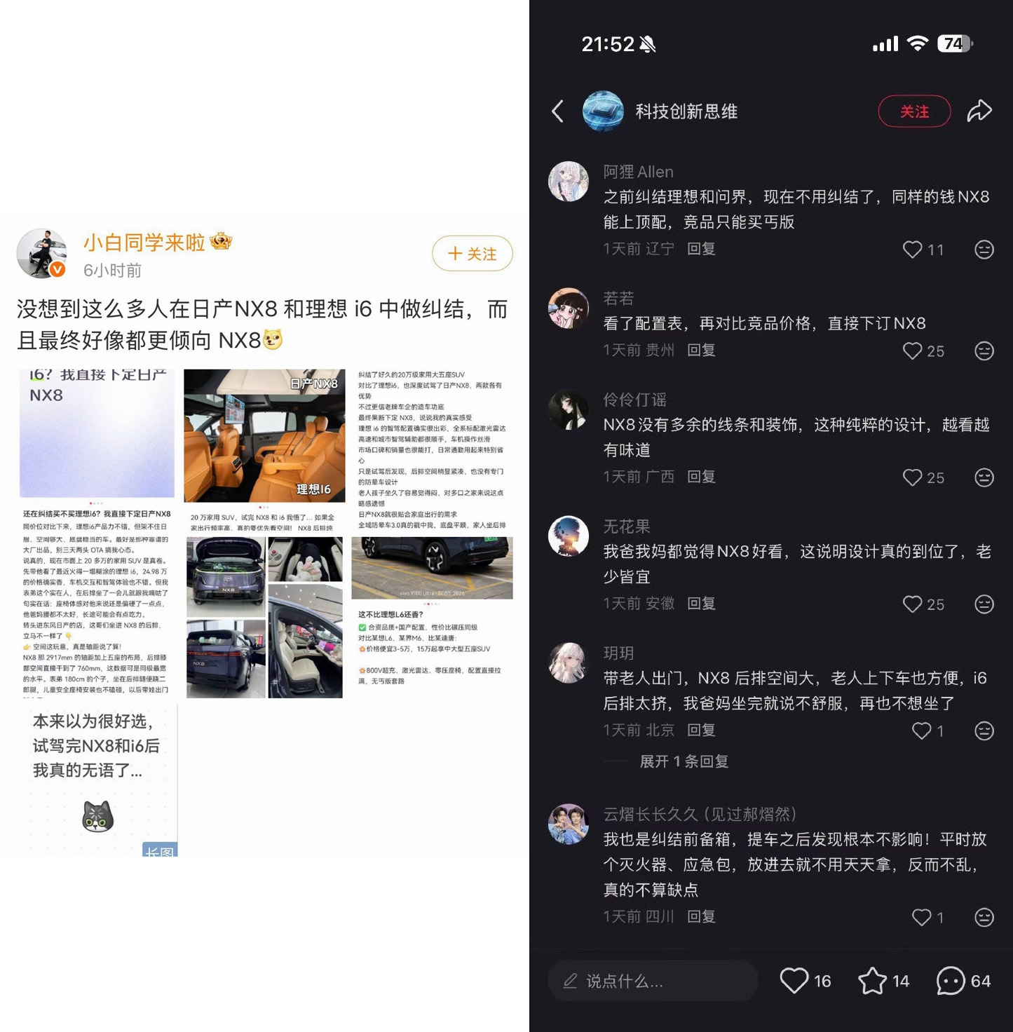 李想贴出的截图显示,微博、小红书等社交媒体平台出现大量“试完NX8和i6后我选了日产”的对比帖,评论区则屡屡出现“NX8后排空间大”“NX8没有多余的线条和装饰”“理想i6后排太挤”等拉踩话术。