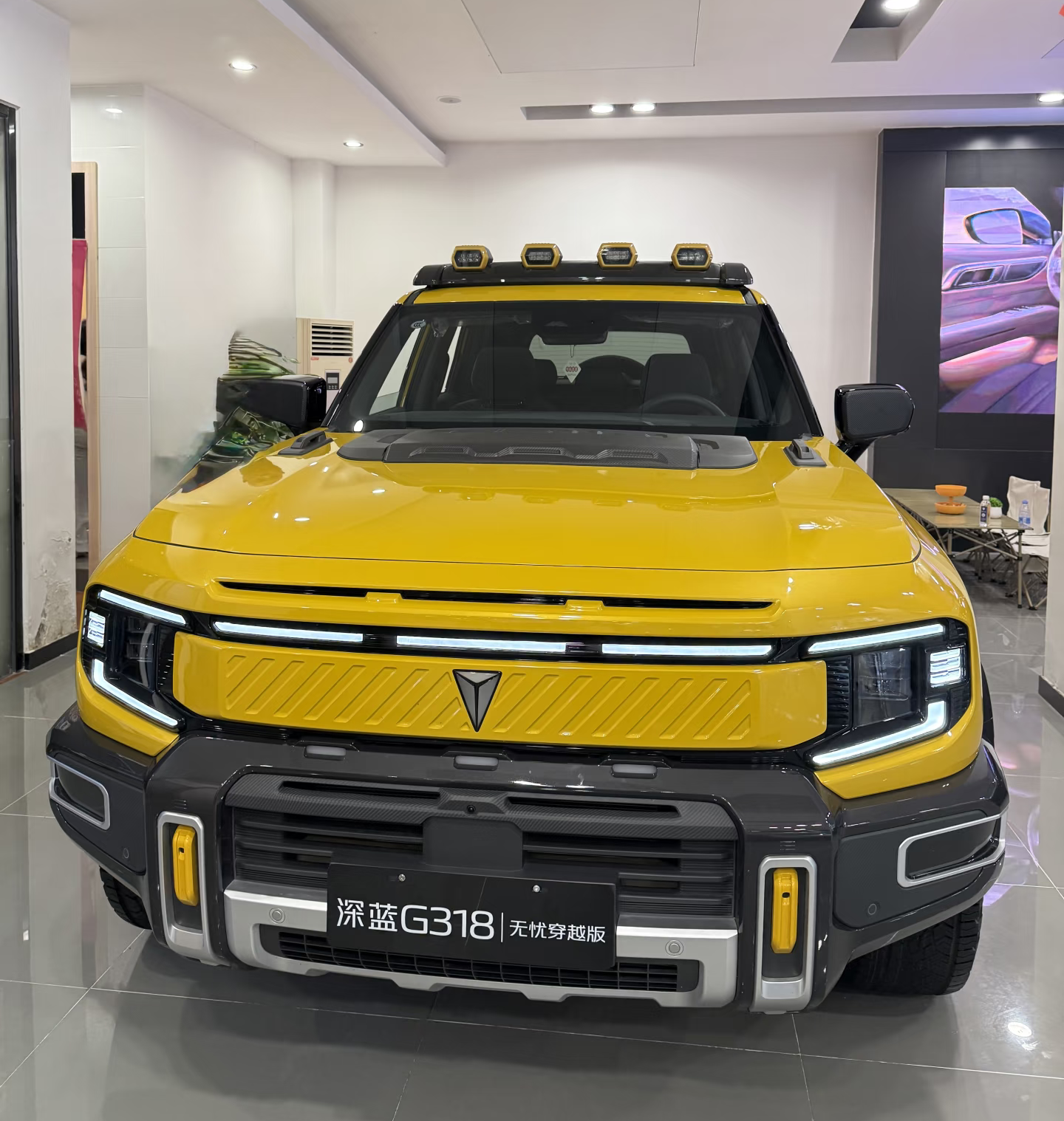 从已公布的官方图片来看,G318整体造型方正硬朗,线条笔直刚毅,完美诠释了硬派越野车的设计风格。前脸采用封闭式设计,搭配C字形大灯组,中间镶嵌长安深蓝品牌标识,保险杠造型粗壮有力,展现出强烈的越野气息。