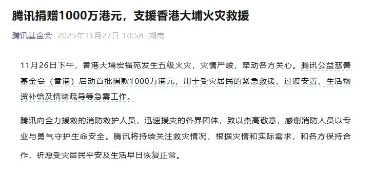 腾讯基金会上午官宣,腾讯公益慈善基金会(香港)启动首批捐款1000万港元,用于受灾居民的紧急救援、过渡安置、生活物资补给及情绪疏导等急需工作。腾讯表示,将持续关注救灾情况,根据灾情和实际需求,和各方保持合作,祈愿受灾居民平安及生活早日恢复正常。