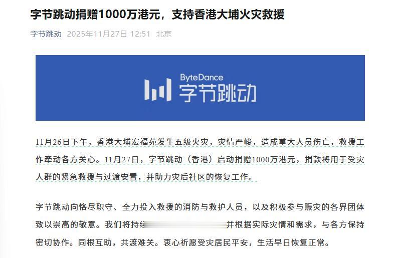 字节跳动午后宣布,字节跳动(香港)启动捐赠1000万港元,捐款将用于受灾人群的紧急救援与过渡安置,并助力灾后社区的恢复工作。