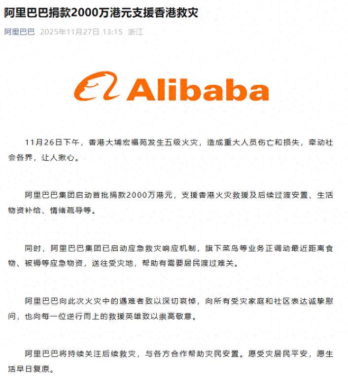 11月27日午后,阿里巴巴集团官微宣布启动首批捐款2000万港元,支援香港火灾救援及后续过渡安置、生活物资补给、情绪疏导等。