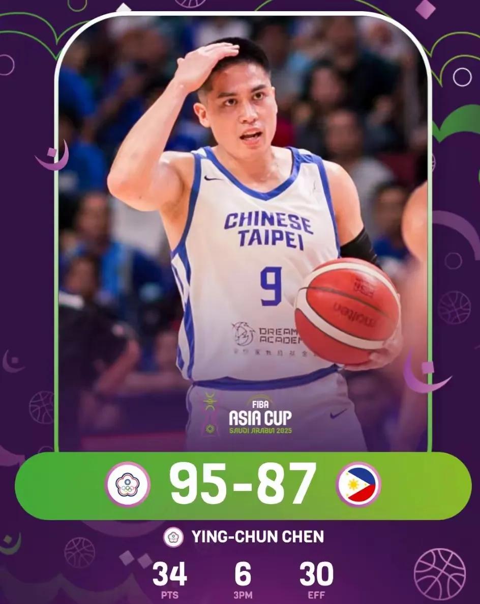 二、 陈盈骏炸裂之夜,一人打崩菲防线冷门背后,一位CBA球星成为最耀眼的胜负手——中国台北队后卫陈盈骏。这位效力于北京队的控卫,独砍34分,三分线外8投6中,几乎弹无虚发。