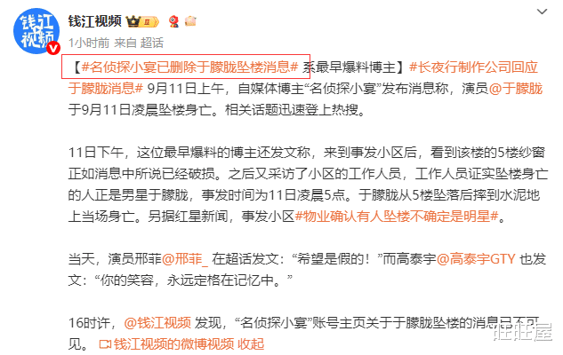 目前,最早传播于朦胧坠楼消息的网络账号已删除博文。