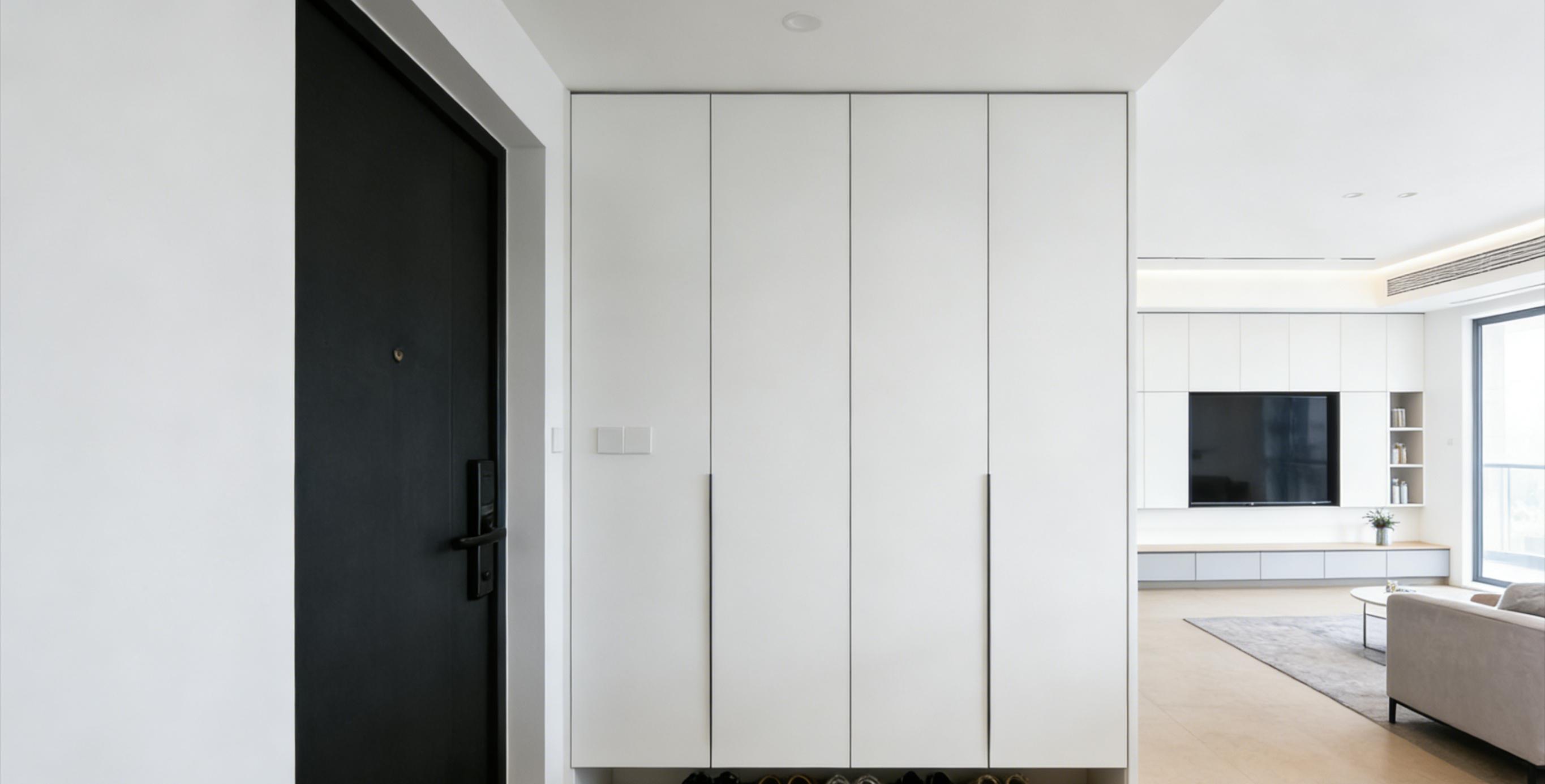 入户与收纳一体化:入户右侧定制17cm极窄鞋柜,延伸至客厅形成整体置物柜,打造从落灰到餐储的系统收纳方案。鞋柜采用无拉手设计,内置弹簧器开关,外观与墙面融为一体,弱化柜体突兀感,视觉上更显整洁。紧邻鞋柜设置外移洗漱台,与鞋柜统一定制形成一体式收纳空间,台面选用人造石英石,防水耐用,同时实现卫生间干湿分离的前置优化。