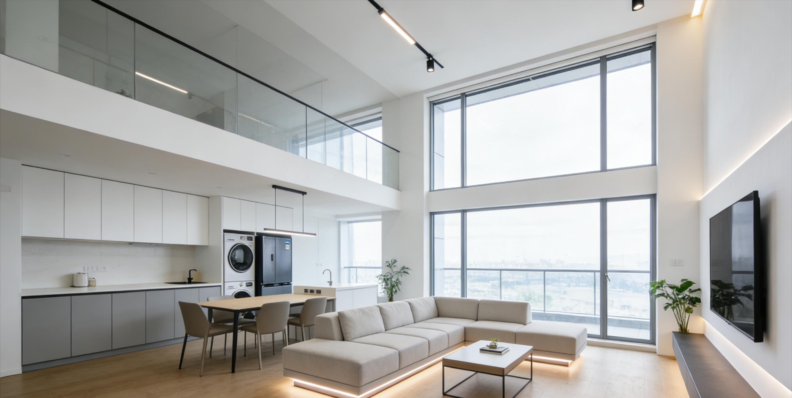 挑空客厅:客厅紧邻厨房,依托挑空区域打造开放式布局,保留全景落地窗,让4.2米挑空带来的通透感与采光优势充分发挥。家具选择简约小巧的直排2.1m模块沙发与悬浮电视柜,电视柜底部留空30cm,可收纳扫地机器人,也让空间更显轻盈。灯光设计摒弃传统主灯,采用磁吸轨道灯+沙发上方线性灯带的组合,既满足照明需求,又避免主灯压层高的问题。