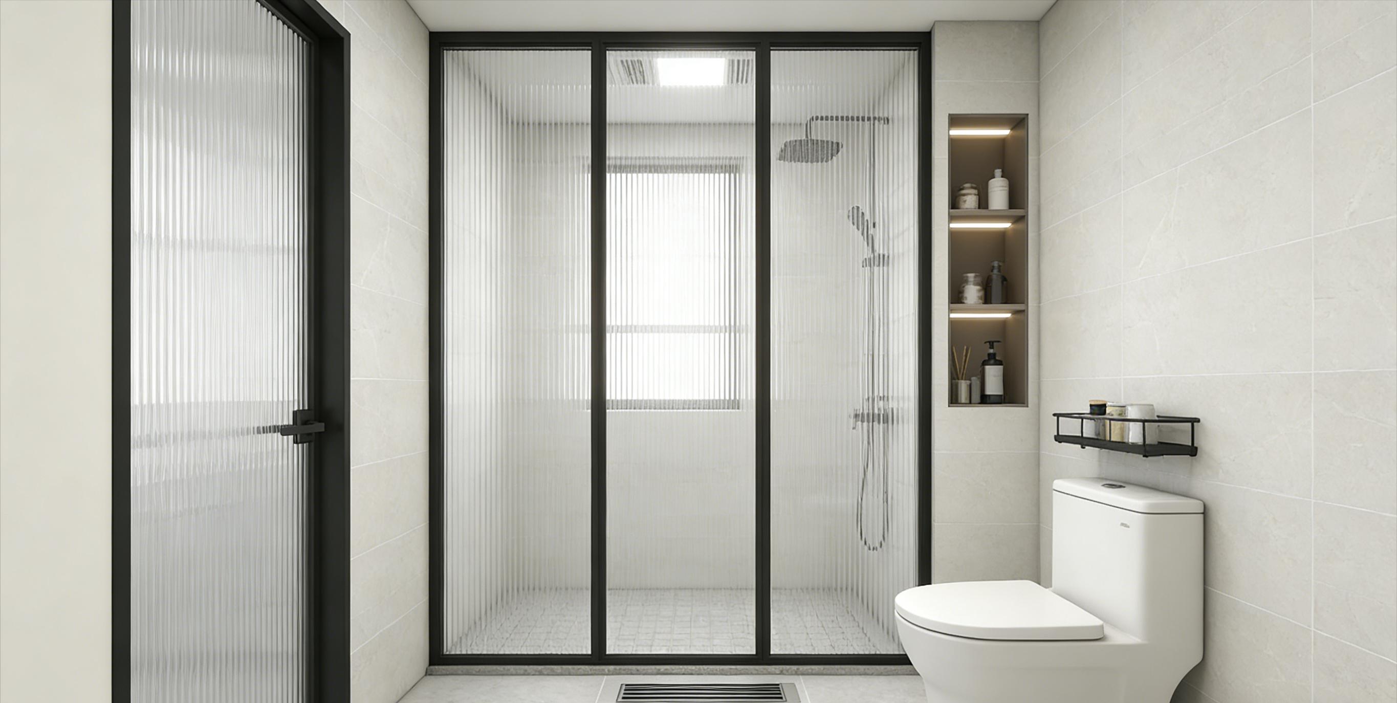 干湿分离卫生间:卫生间位于入户内侧,采用三联动玻璃门划分淋浴区与马桶区,玻璃门选用长虹玻璃,兼顾隐私与通透感。内部设置壁龛收纳洗漱用品,马桶上方安装置物架,进一步提升收纳能力。地面选用防滑瓷砖,搭配隐形地漏,既实用又符合现代简约的整洁美学。