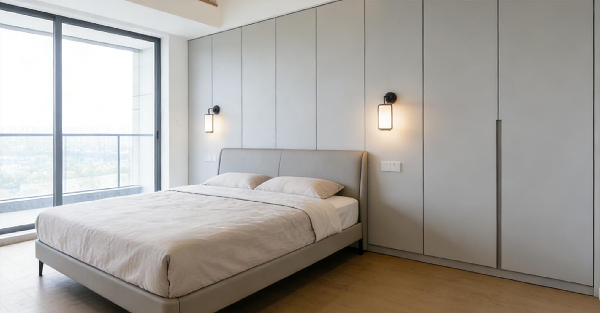 舒适主卧:主卧占据二楼大部分空间,地面铺贴浅色木地板,营造温馨氛围。室内摆放1.8米床与简约床头柜,床尾靠墙定制一整排嵌入式到顶衣柜,收纳夫妻二人的衣物绰绰有余。衣柜门选用与墙面同色系的浅灰色,无拉手设计让视觉更整洁。床头安装简约壁灯,替代传统台灯,节省床头柜空间,同时提升空间的设计感。