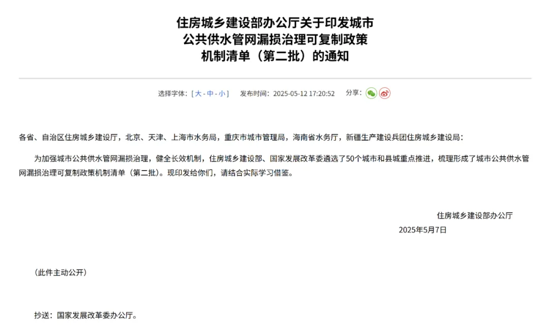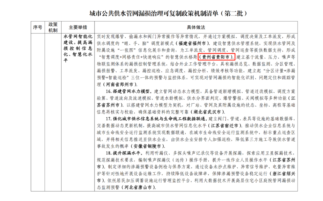 贵州省住房城乡建设厅指导各地严格管控城市公共供水管网漏损现象,杜绝隐形资源浪费,扎实推进供水管网漏损排查治理升级改造工作,其中贵阳市供水管网智能化建设经验做法入选住房城乡建设部、国家发展改革委联合发布的《城市公共供水管网漏损治理可复制政策机制清单(第二批)》。