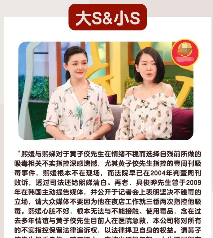 黄子佼公开爆料之后,外界也联想到汪小菲指控大小S滥用药物一事,徐家姐妹俩再次遭到质疑,她们通过声明做出澄清,否认涉毒嗑药,还放话要起诉黄子佼。