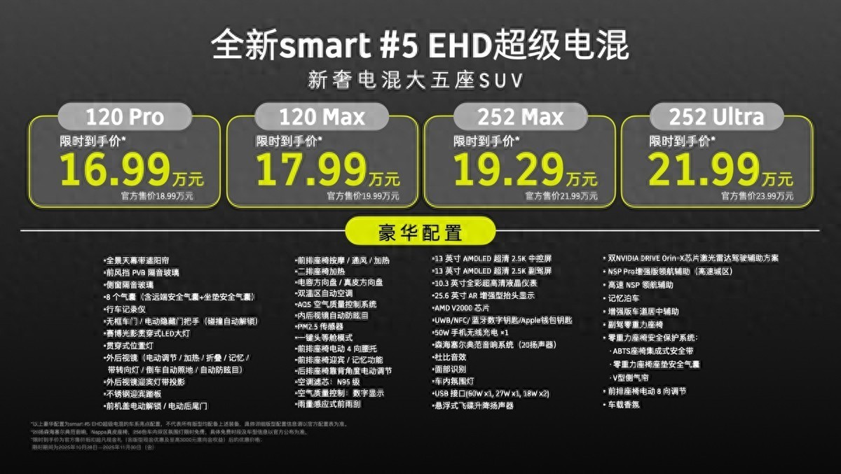 smart #5 超级电混全系标配120项豪华配置,限时到手价仅16.99万起,以极具竞争力的价格重新定义了细分市场的价值标准。为回应市场热情,品牌特别推出跨年购置税补贴政策:2025年11月30日前完成大定支付的用户,如因非用户原因导致车辆实际开票时间延后至2026年1月1日及以后的,smart将在最高额补贴范围内全额补贴因购置税政策调整产生的费用差额,单辆车最高补贴金额不超过1.5万元。