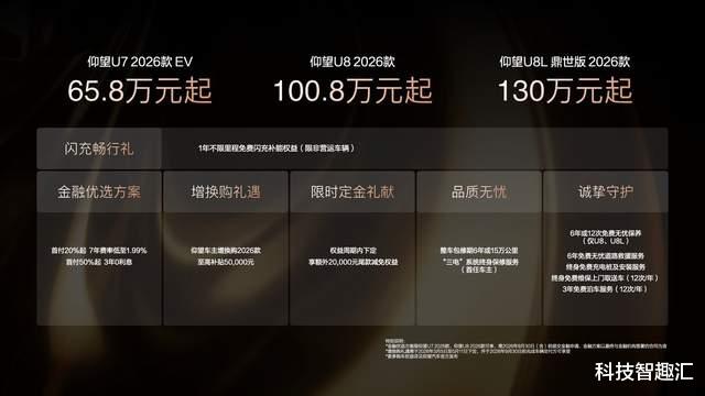 从U7畅享极致驾趣,到U8拓宽人生疆域,再到U8L构筑鼎级安全,仰望2026款旗舰矩阵覆盖了运动豪华、硬派越野、行政豪华三大场景。闪充技术赋能极致体验,三款新车的联袂登场,是“超越极致,前所未有”品牌精神的最新注脚。仰望始终相信,极致技术不应是冰冷的参数,而应是赋能用户创造价值、革新体验的力量。未来,仰望将继续以颠覆性技术创新为驱动,坚持在这条难而正确的道路上,与所有同行者一道,创造历史,改变世界。