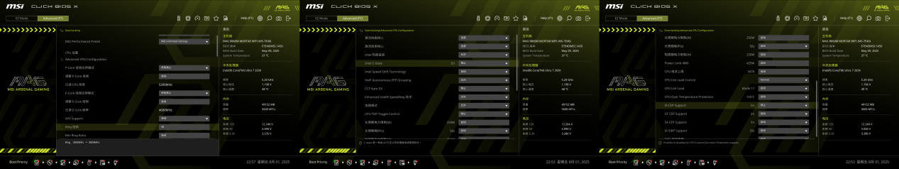 首先进入BIOS进行调试,首先将intel默认配置改为“MSI Unlimited Settings”,解放功耗墙,然后开启XMP,让内存进入7600频率,关闭IA CEP,降低核心温度,关闭C模式,将Ring频率设置为38。