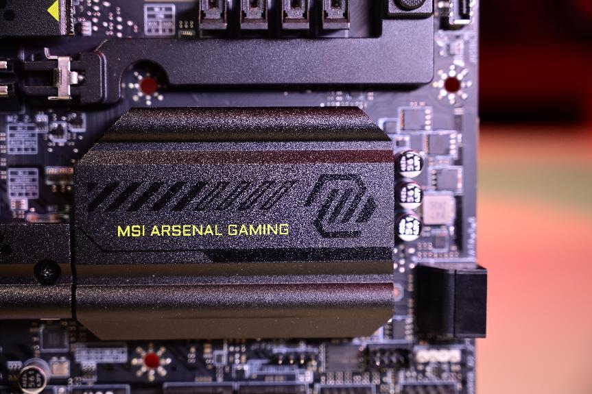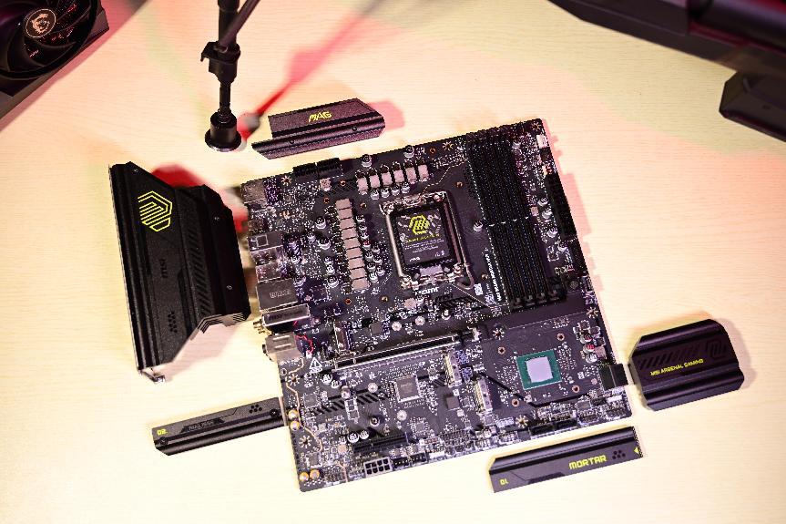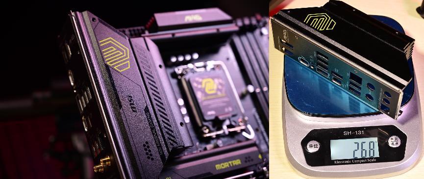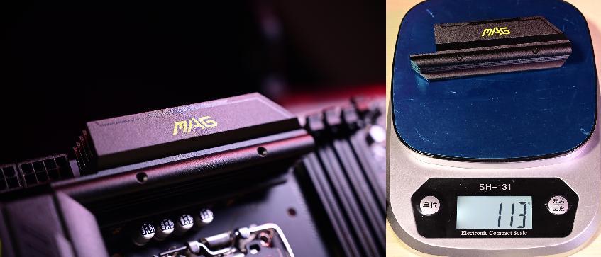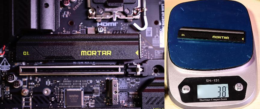 “一号位”不管是游戏里还是硬件上都是非常重要的,在微星迫击炮主板的1号固态位上一定会有散热装甲,装甲重量38g,这一代迫击炮散热装甲上印刷有相同的黄绿色MORTAR标志和快拆设计标志箭头。