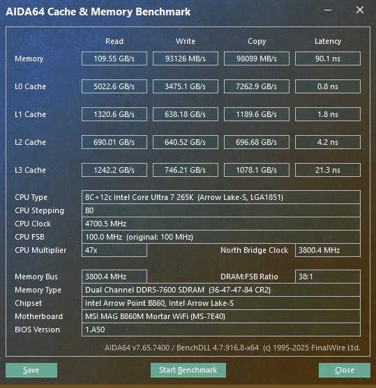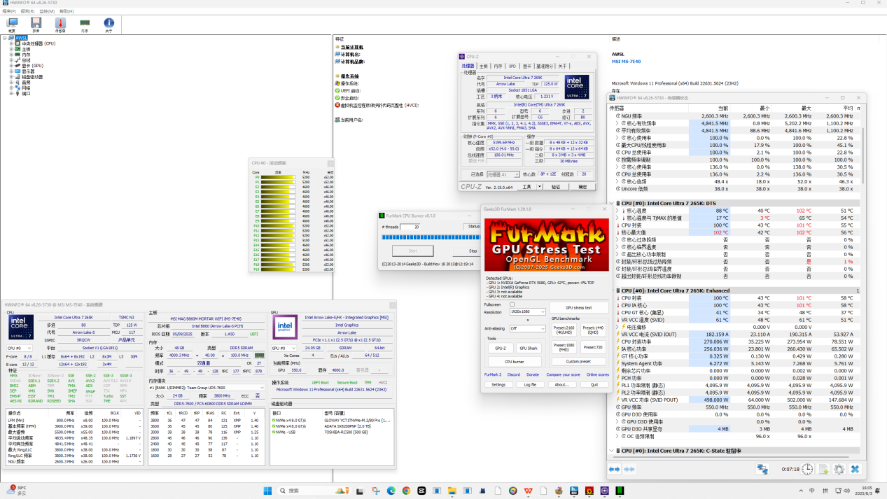 除了内存,我们还需要关注的是主板对CPU的供电支持是否充足,由于B板是不支持手动超频的,所以我们着重关注睿频表现即可,在FurMARK 2的CPU压力测试中,最大功耗也是跑到了275W,甚至超过了intel 英特尔® 酷睿™ Ultra 7 处理器 265K本身的的睿频功耗上限,说明主板本身的供电是给够了的。