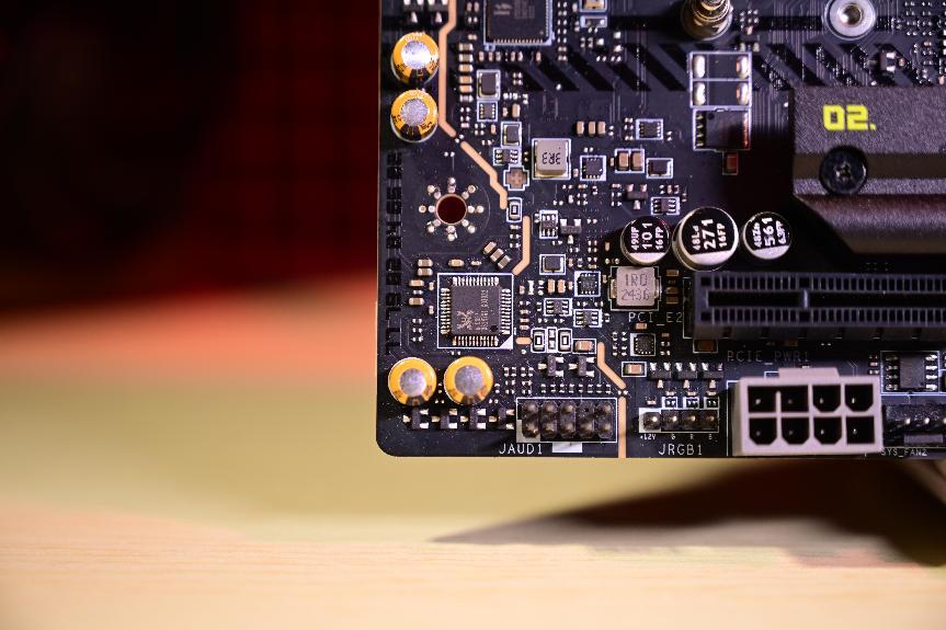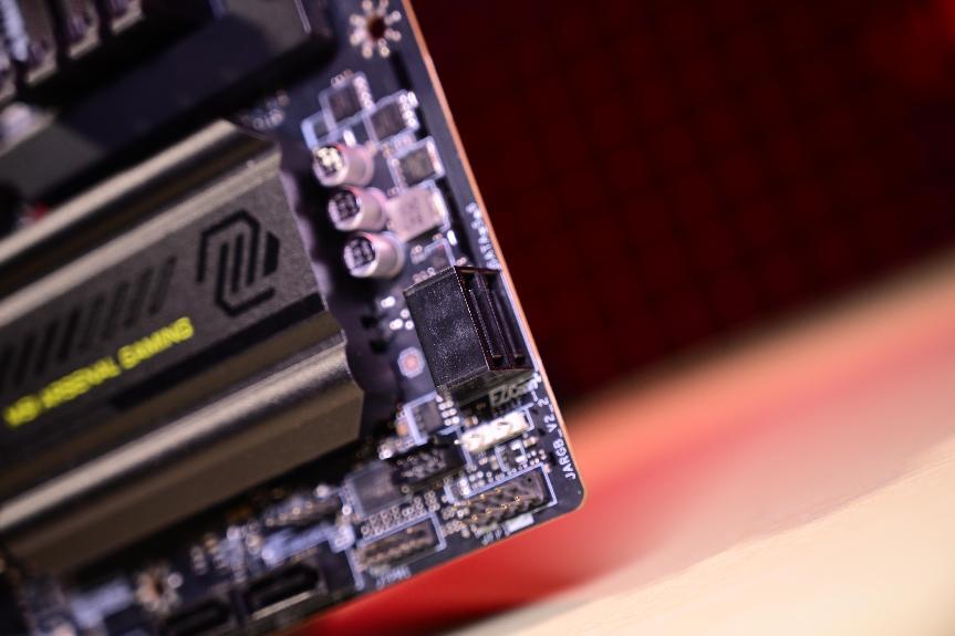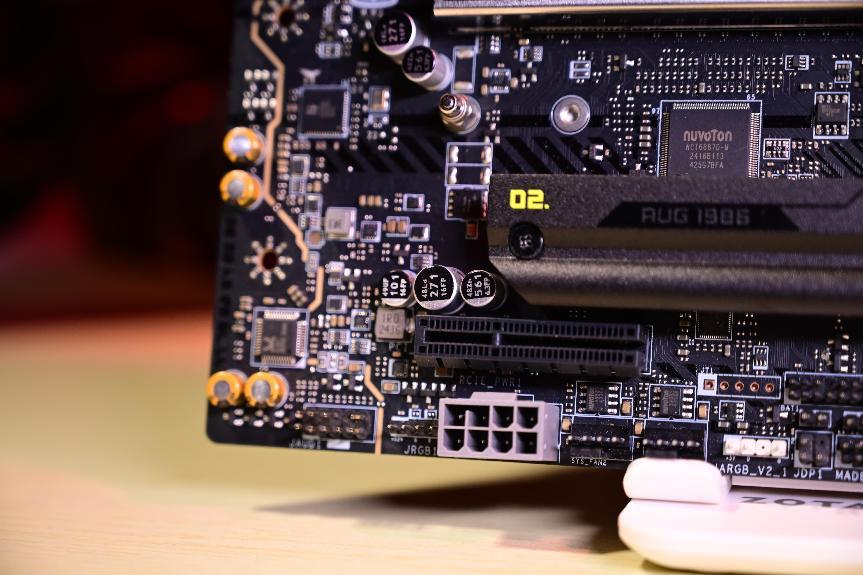 CPU风扇接口和水冷接口和传统主板相比更偏向右边,这种设计更有利于走背线;机箱风扇接口下方有Debug灯和一组5v_ARGB接口。