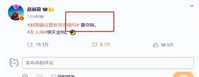 网友由此产生了联想,那就是这是对赵丽颖的点醒,因为赵丽颖就在这条微博发出不久前发了条“算你妹”的微博,这条微博为了回复热搜“赵丽颖这算是官宣了吗”。是对这条热搜的质疑。