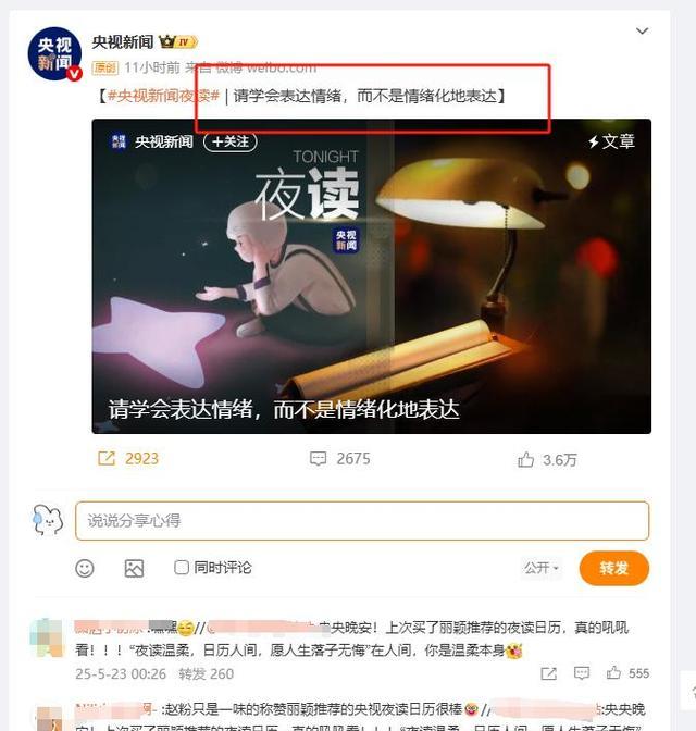 在22日的23:59,央视照常发了一条央视新闻夜读的微博,但这个夜读的名字相当有意思,名为“请学会表达情绪,而不是情绪化表达”。