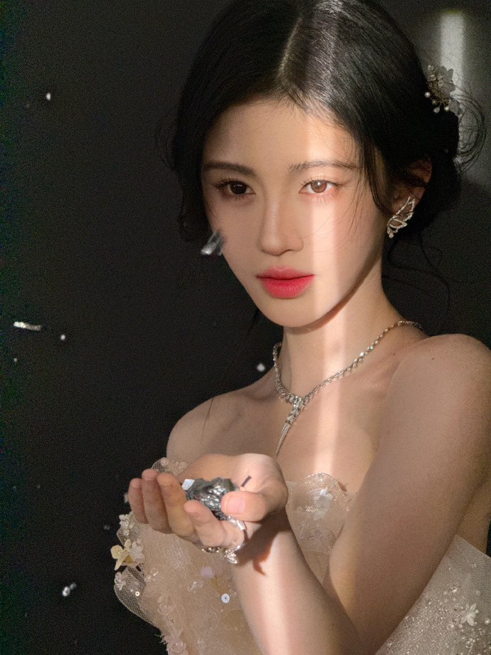 她轻盈地伸出手,手中似乎托着一颗璀璨的珠宝,背景星光点点,给人一种奇幻的视觉效果,不过,除了服饰,鞠婧祎的妆容也为她的整套造型增色不少。她的眼妆与整体造型相得益彰,眼睛周围的珠光点缀恰到好处,使得她的眼神既深邃又充满神秘感。
