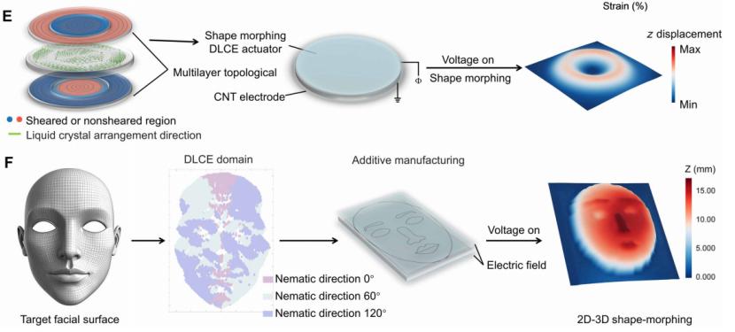 近日,宁夏大学教授冒杰和团队发明了一种通过剪切辅助 4D 打印制造的特殊材料,它的名字叫做介电液晶弹性体,它能像肌肉一样在电场的指挥之下,精确、快速地变换成为各种复杂的三维形状,并且还能变回原样,打破了传统上认为介电弹性体只能做简单变形的认知。这项技术将能为未来的软体机器人、生物医疗和自适应系统打开全新的大门。