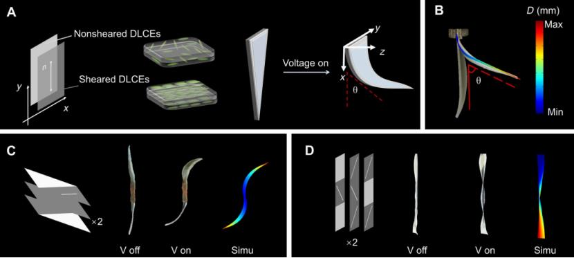 当给材料两面贴上电极并通电的时候,电场会产生一种叫做麦克斯韦应力的力来挤压材料。由于不同区域软硬不同,它们被挤压收缩的程度也不同,这种步调不一致就导致了整张材料发生弯曲、扭转等复杂的立体变形。就像我们在折纸的时候,在不同位置预先折出不同的折痕,一推就能变成千纸鹤一样,本次团队则是在微观分子层面折出了隐形的折痕。