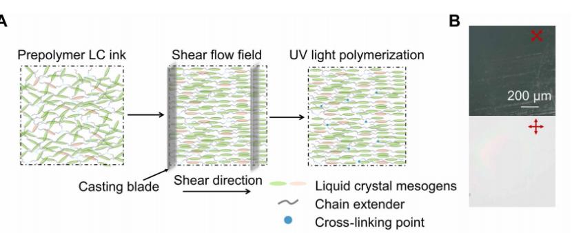 这款打印机有一个可以移动的刮刀。在打印每一层材料的时候,刮刀移动产生的剪切力就像一把分子梳子,能让液晶分子朝着特定方向乖乖站队。随后,紫外线立刻就可以照射,将这些排列好的分子冻结固定住。通过控制刮刀的速度和高度,就能在不同区域之内制造出不同方向的分子排列图案。