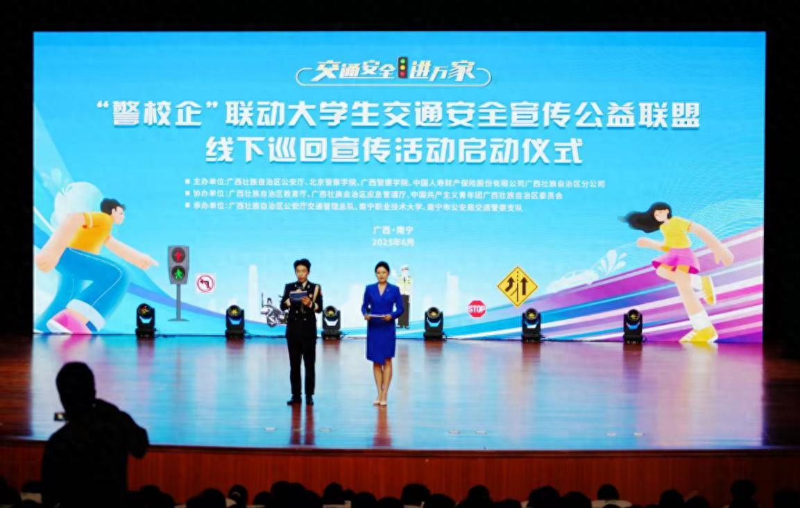 6月13日上午,首场“警校企”联动大学生交通安全宣传公益联盟巡回宣传活动在南宁职业技术大学正式开讲!由广西壮族自治区公安厅交通管理总队联合北京警察学院、广西警察学院、中国人寿财险广西分公司及本地高校建立的大学生交通安全宣传公益联盟,将投身于交通安全宣传一线传播交通安全理念和事故快处快赔等金融保险知识,以点带面、以面带全,带动更多人自觉培树良好的交通行为习惯,做好现代交通文明接力赛中的关键一棒。