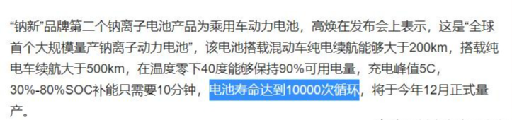 最后我们看宁德时代的官方的宣传,钠离子电池可以满充满放超过1万次,相对于现在主流的磷酸铁锂和三元锂电池的满充满放3000次左右的使用寿命来说,大幅提高了三倍以上,而且成本能够大幅的下降的话,那对于买车的消费者来说,确实是花小钱办大事儿的最好的选择。