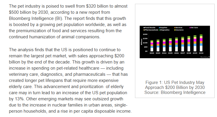 根据Bloomberg Intelligence的报告,全球宠物行业规模目前约为3200亿美元,预计到2030年将增长至近5000亿美元,期间增幅超过45%。