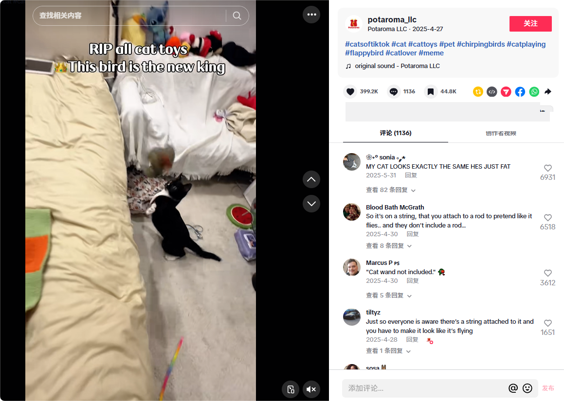 视频火了,里面那只被猫咪疯狂“追杀”的电动仿生鸟玩具,也跟着冲上平台宠物玩具热销榜。