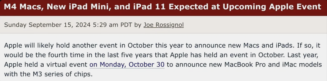 预计届时将带来多款新品,包括:iPad mini 7、iPad 11、新款MacBook Pro、新款iMac和新款Mac mini。