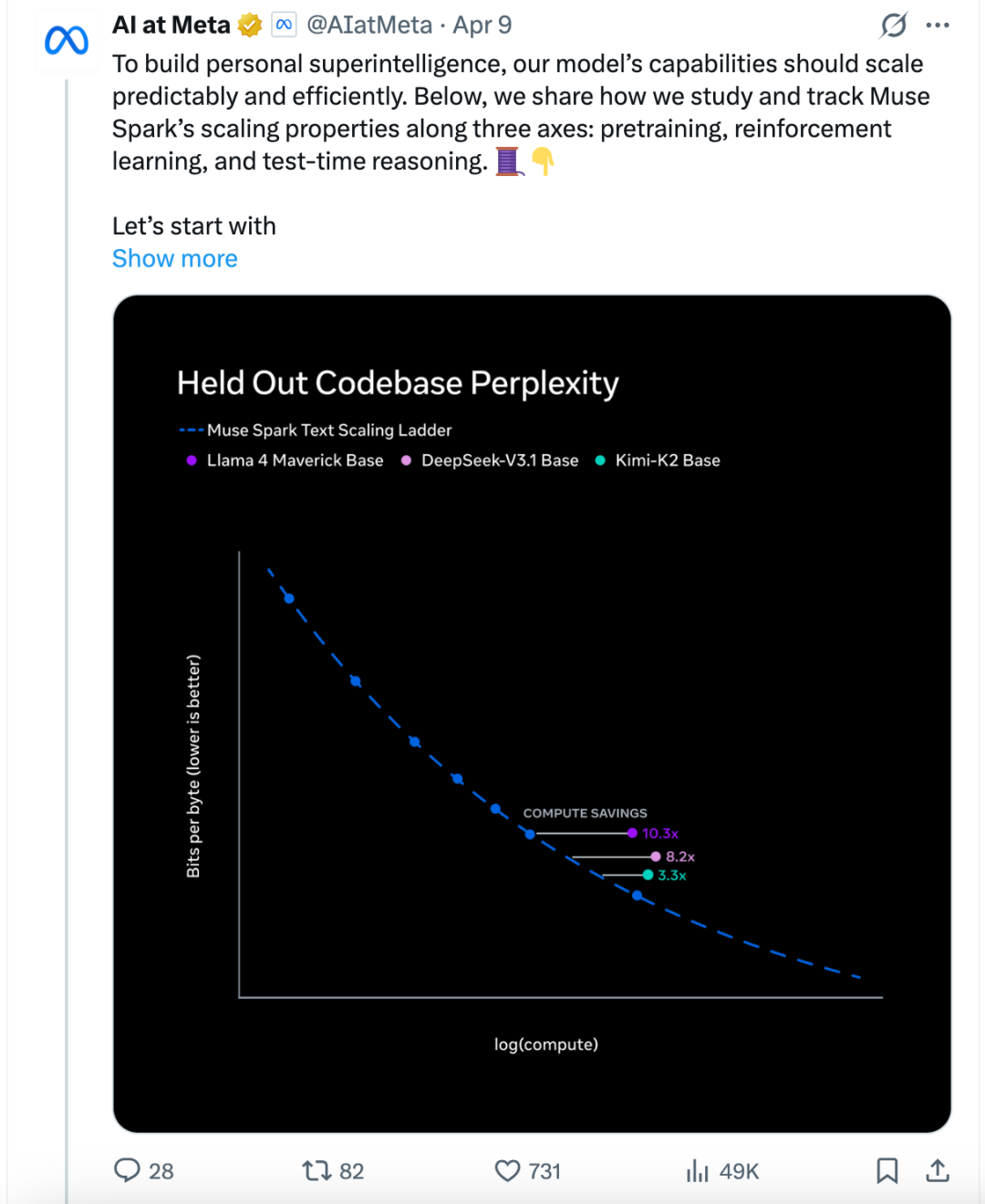 而抛开那些花里胡哨的跑分,Muse Spark背后真正可怕的地方,其实藏在Meta公布的一项技术数据里。