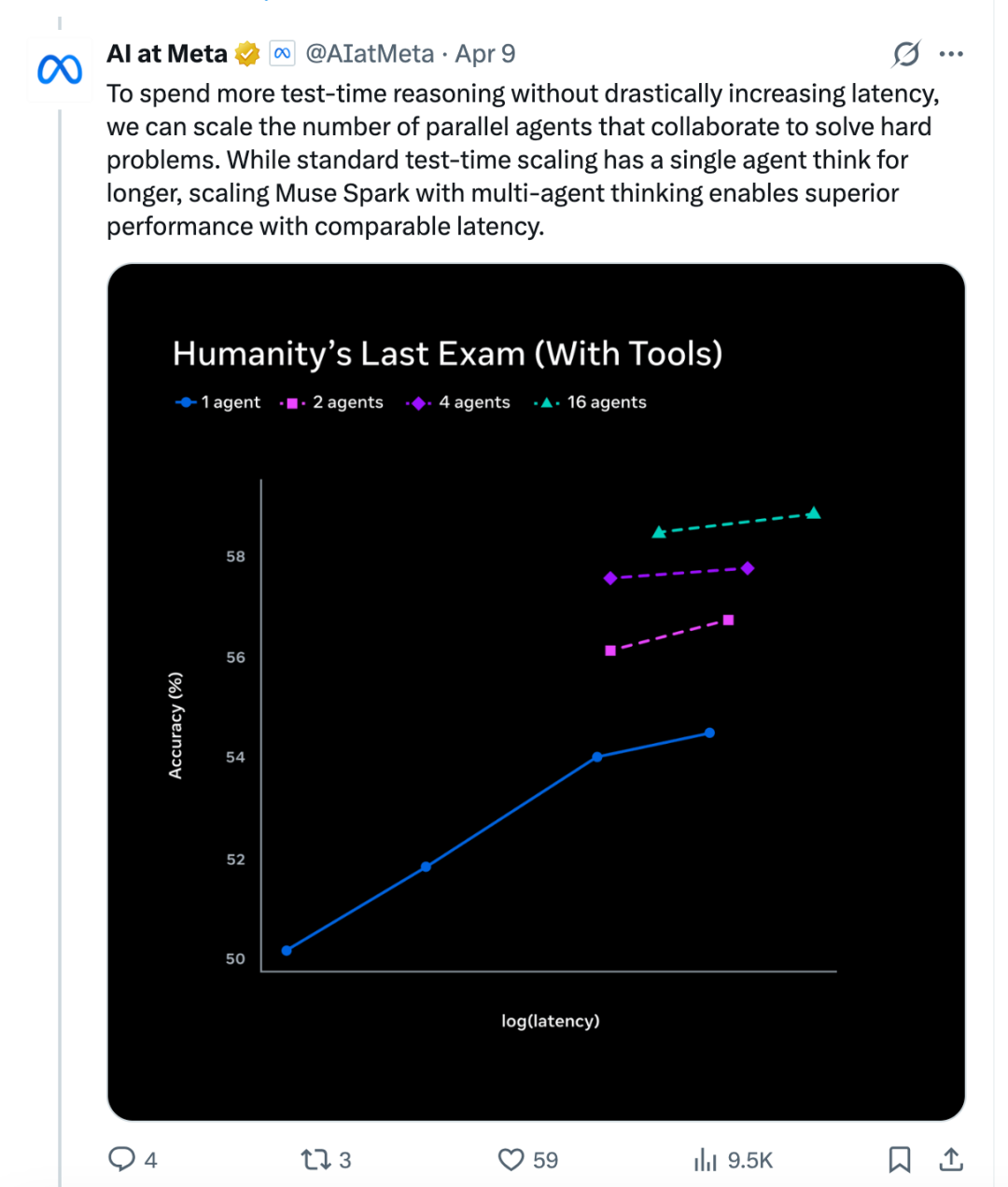 传统的推理模式是让一个模型在那闷头使劲想(延迟高),而Muse Spark是同时拉起好几个子智能体,各自处理不同维度的信息,最后汇总。