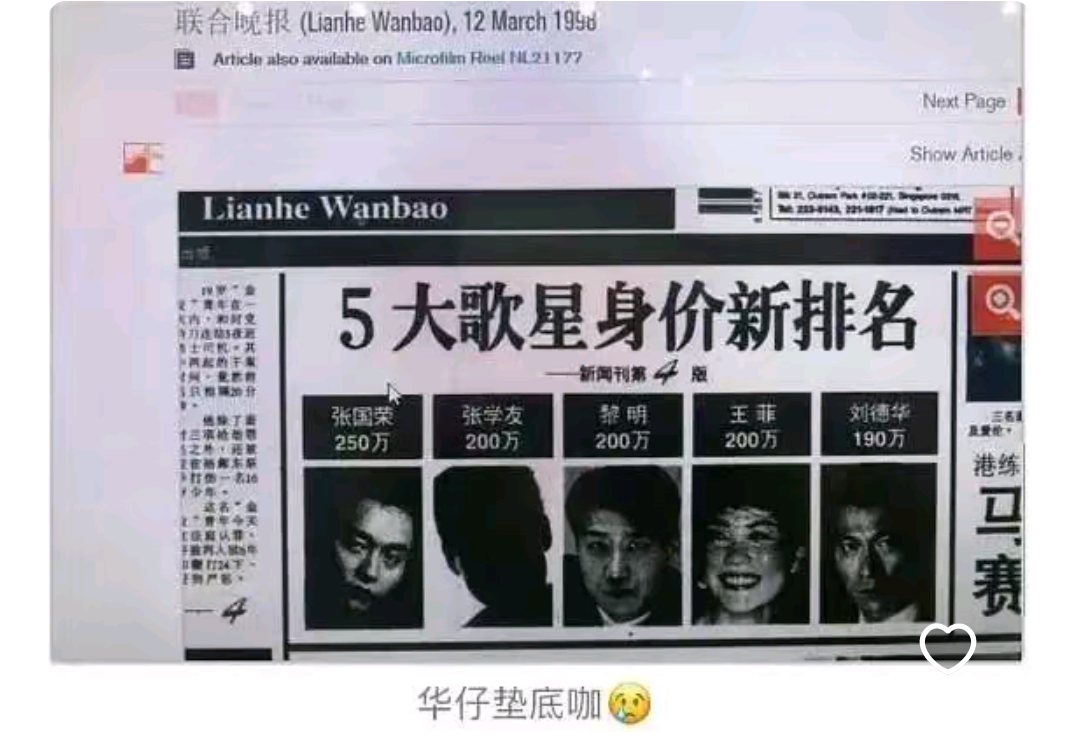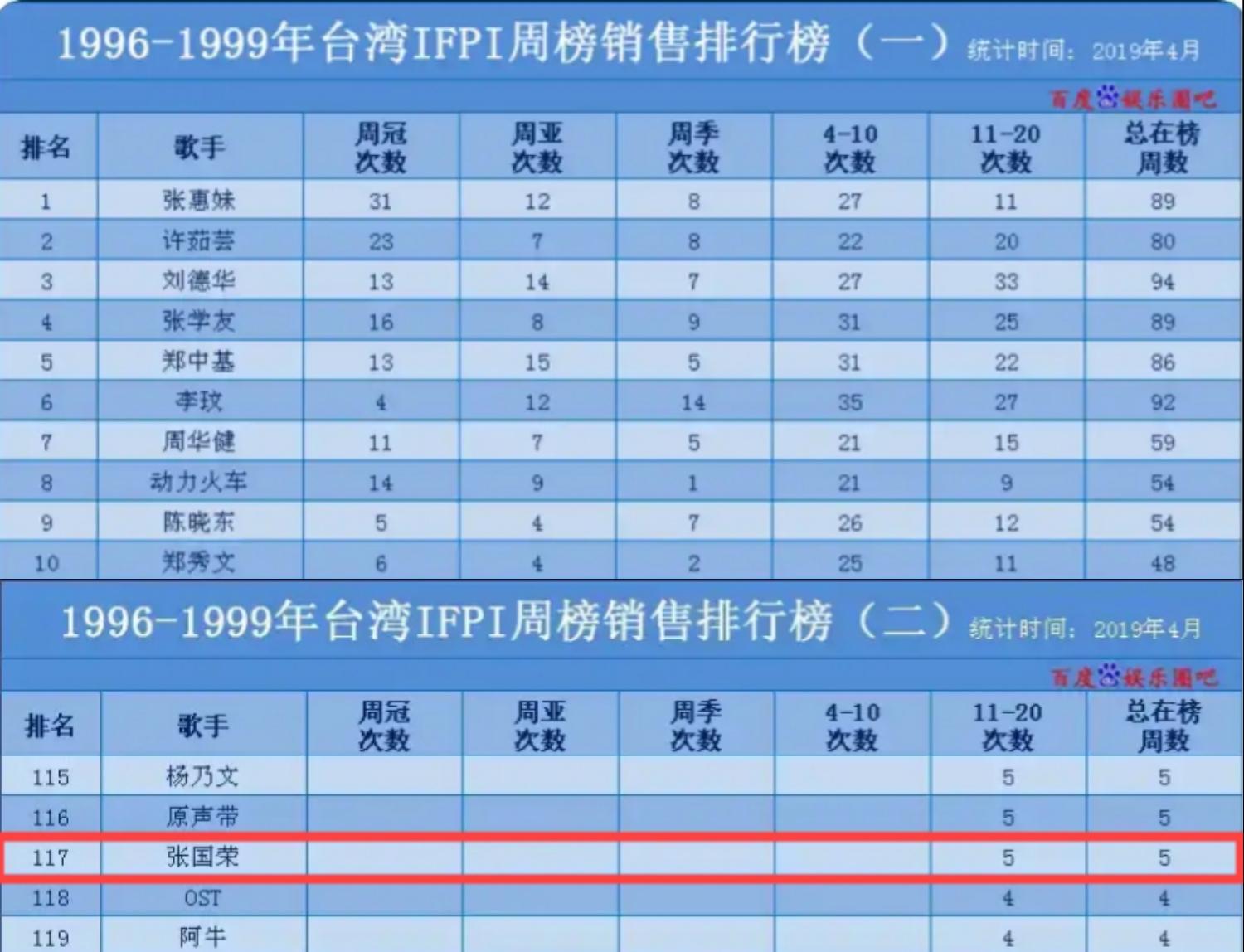 张国荣:11-20名5次、总在榜周数5周。张国荣又是百名开外。