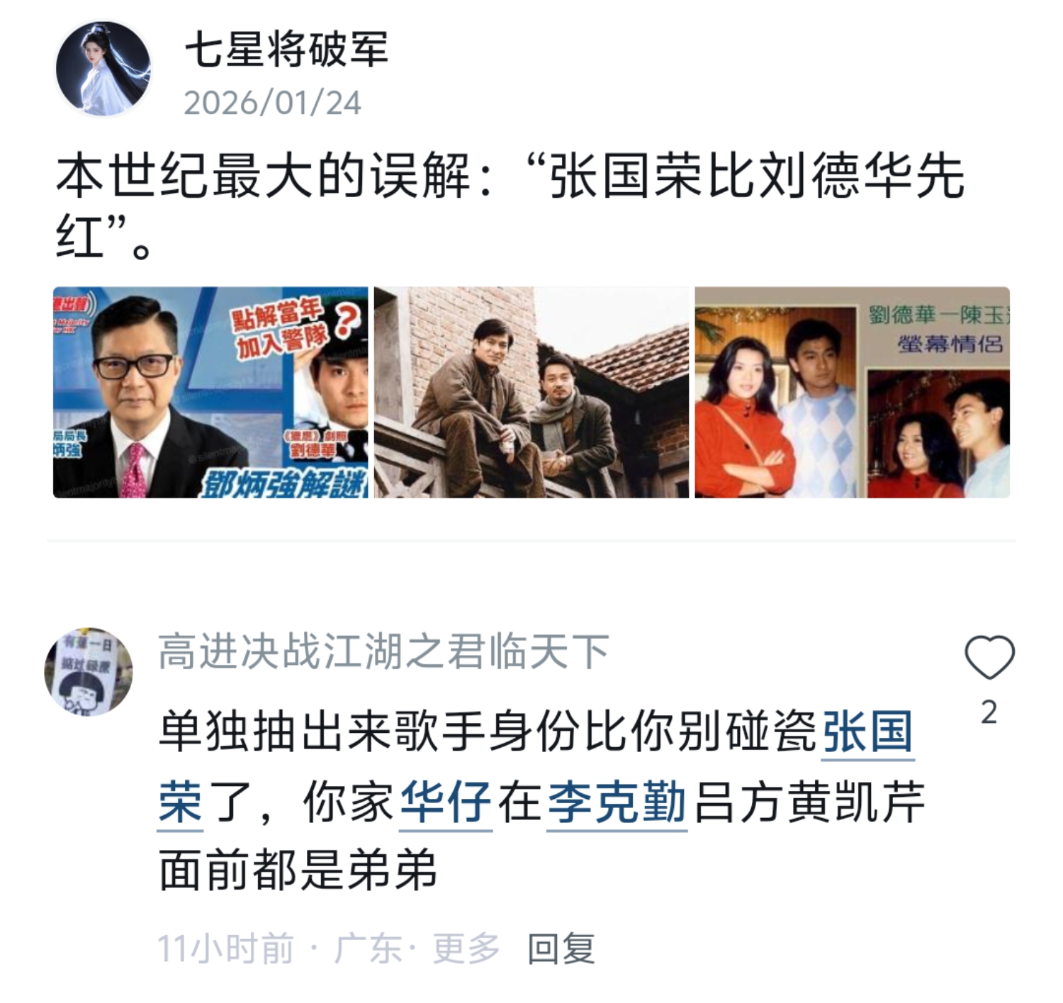 前面我发了一个帖子,于是评论区有一个张国荣粉丝给我雷到了,我就想问问,你们这些在网络时代在那些营销文和营销视频下出现的跟风粉,是不是在自己臆想的世界里出不来了?是谁给你们的勇气拿你们的哥哥跟刘德华比歌坛的?你们的哥哥说白了就是一个粤语歌手,何德何能碰瓷刘德华这种华语顶级流行天王?