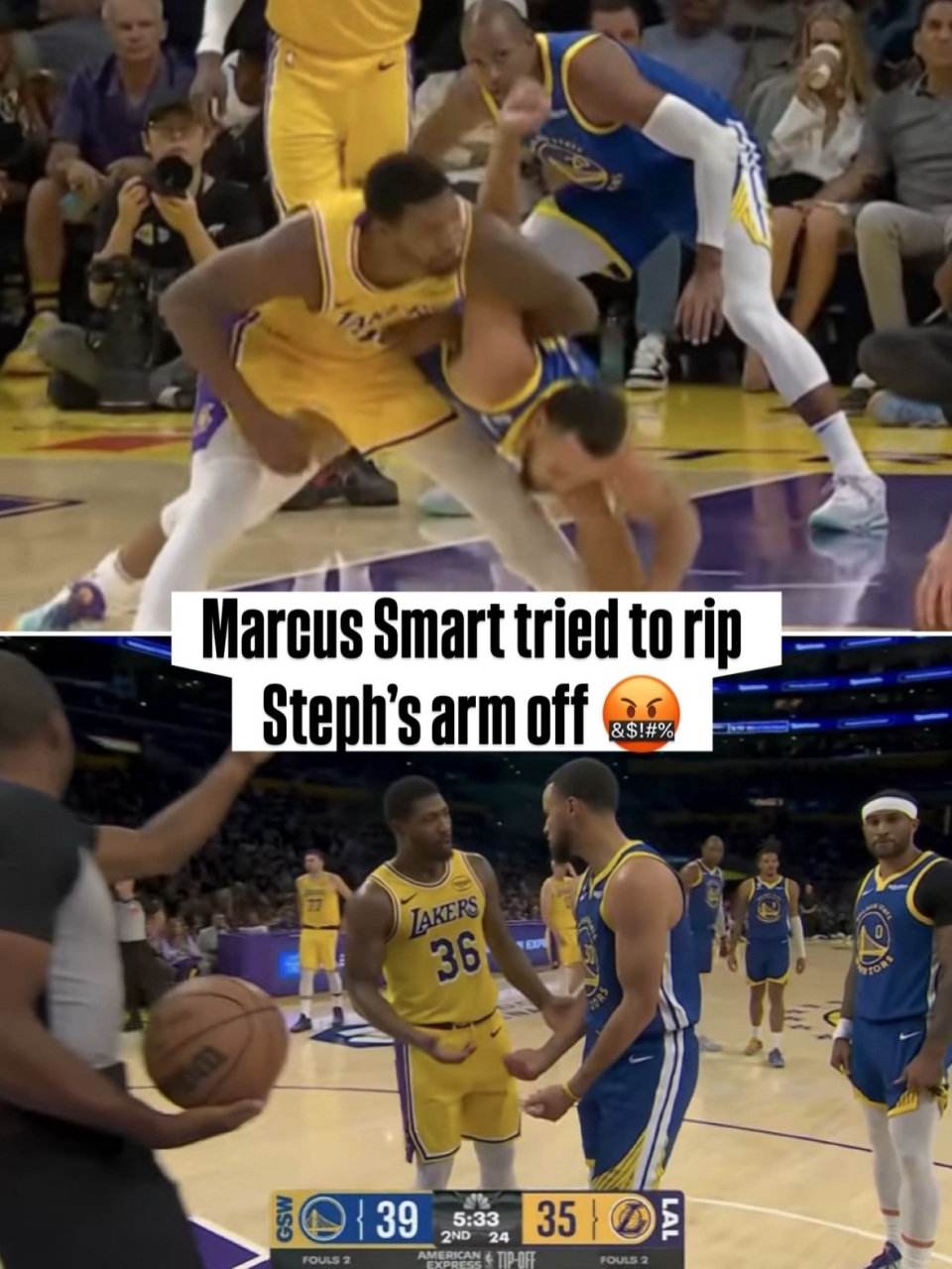 另一个回合中,他夹臂库里被吹一级恶意犯规,这是一个非常危险的动作。好在斯玛特在这节比赛中打开得分账户,两投全中得到5分。