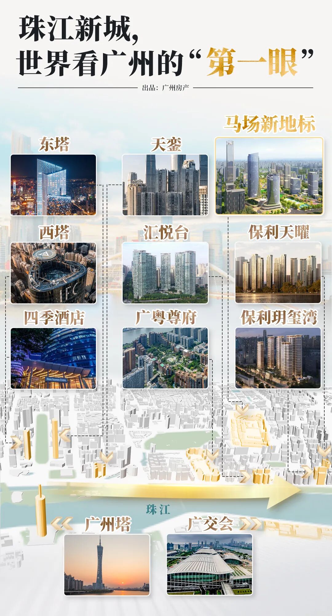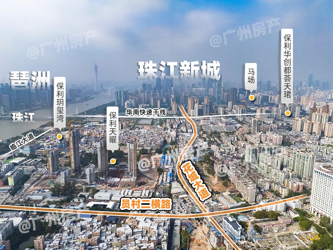 从广州塔、东西塔,到天銮、广粤尊府、汇悦台,再延伸至保利玥玺湾、保利天曜以及马场新地标共同勾勒的珠江新城东段。