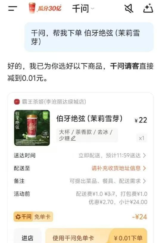 我更新了千问,随手一句“帮我点一杯少冰半糖的奶茶”,它直接问我一句“要不要用免单券”,下一秒就跳到一个已经选好门店、选好规格、选好地址的页面,价格是25,实付0.01,点一下就下单。等我想好“这波羊毛怎么写点评”的时候,奶茶已经在路上了。