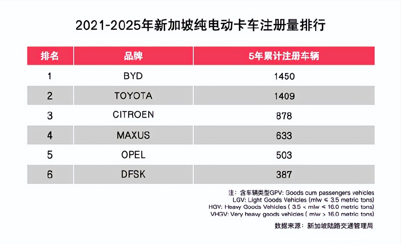 在电动卡车领域,比亚迪于2020年进入新加坡,开始向当地正式交付环卫车T9,成为当地第一家销售电动卡车的公司。2021年-2025年,比亚迪纯电卡车在新加坡五年累计注册量达1450台,排行第一。
