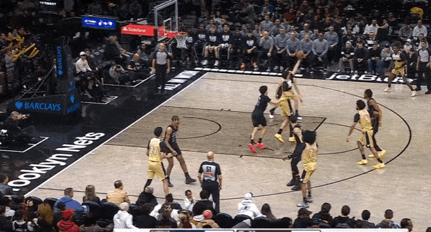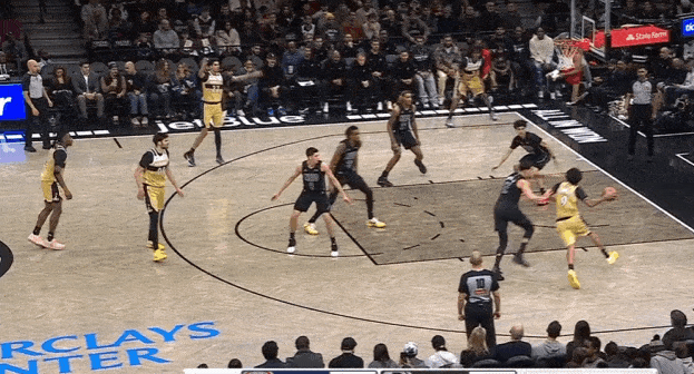 队友持球行进至低位转背身发牌,吉尔和莱利随即衔接“Flare Slip”配合,莱利上前接球后立即使用一二步急停拔起出手三分,以波特的招式顶着波特扑防干扰打进3+1。