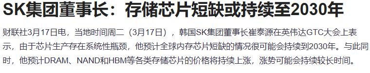 韩国SK集团董事长崔泰源在英伟达GTC大会上表示,由于芯片生产存在系统性瓶颈,他预计全球内存芯片短缺的情况很可能会持续到2030年。今天三星暴涨超7%,海力士暴涨超8%。