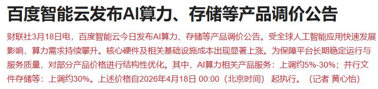 3月18日,阿里云宣布AI算力、存储等产品最高涨价34%,主要原因是Token调用量暴涨,阿里云的MaaS业务百炼在今年1-3月创下了历史最高增速。盘后,百度智能云也发布AI算力、存储等产品调价公告。