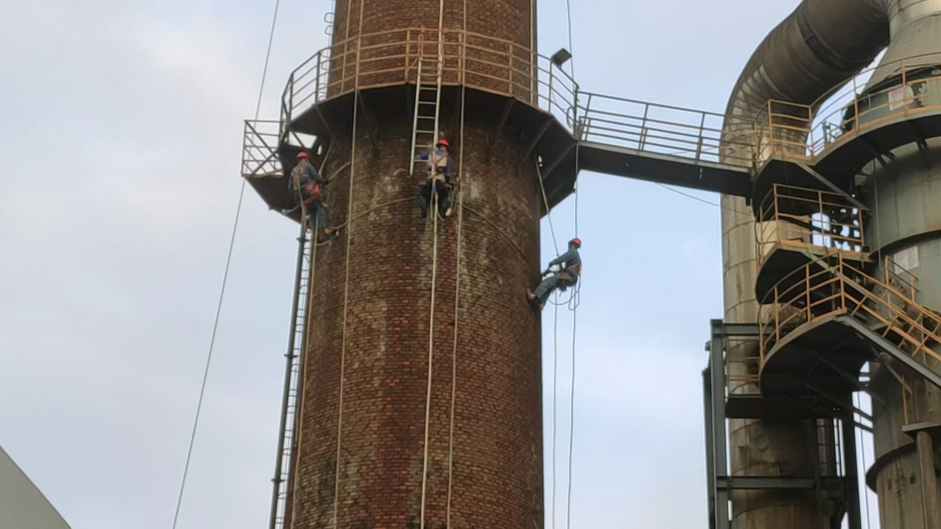 搭设高空作业吊篮,安装防晃限位装置,确保吊篮与烟囱外壁间距均匀;作业人员全程系挂双钩安全绳,工具放入防坠工具袋;对爬梯、避雷带等附属设施采用塑料薄膜包裹防护,避免涂料污染;遇大风(风速≥6 级)、雨雪、高温天气,立即停止高空作业。