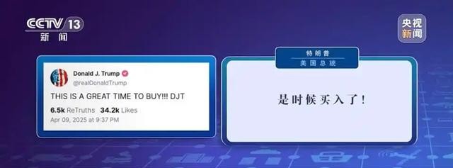 然而,戏剧性的转折发生在4月9日,当天上午9时37分,特朗普突然在其创立的社交平台上发布帖文“这是买入的好时机!!!”,并在结尾处标注了“DJT”。