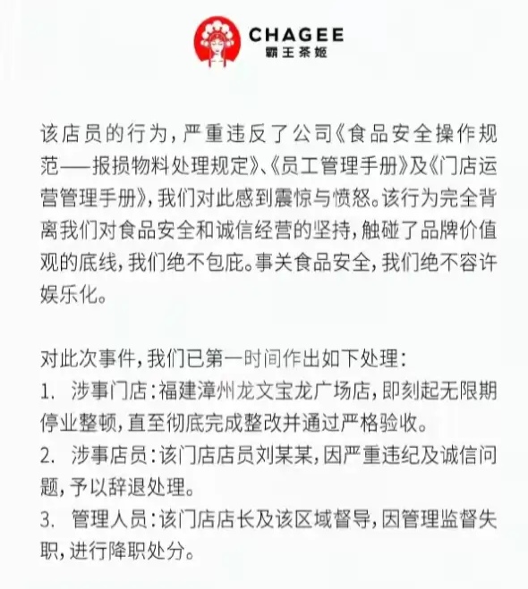 公司那边赶紧开始调查,一边调监控一边联系门店,就怕事情闹得更严重中午十二点五十八分,官方通报出来了,承认视频内容是真的, 但说这是员工用报损废弃的物料摆拍罢了,拍完就扔垃圾桶了,现场也消毒处理了,而且没卖给顾客。