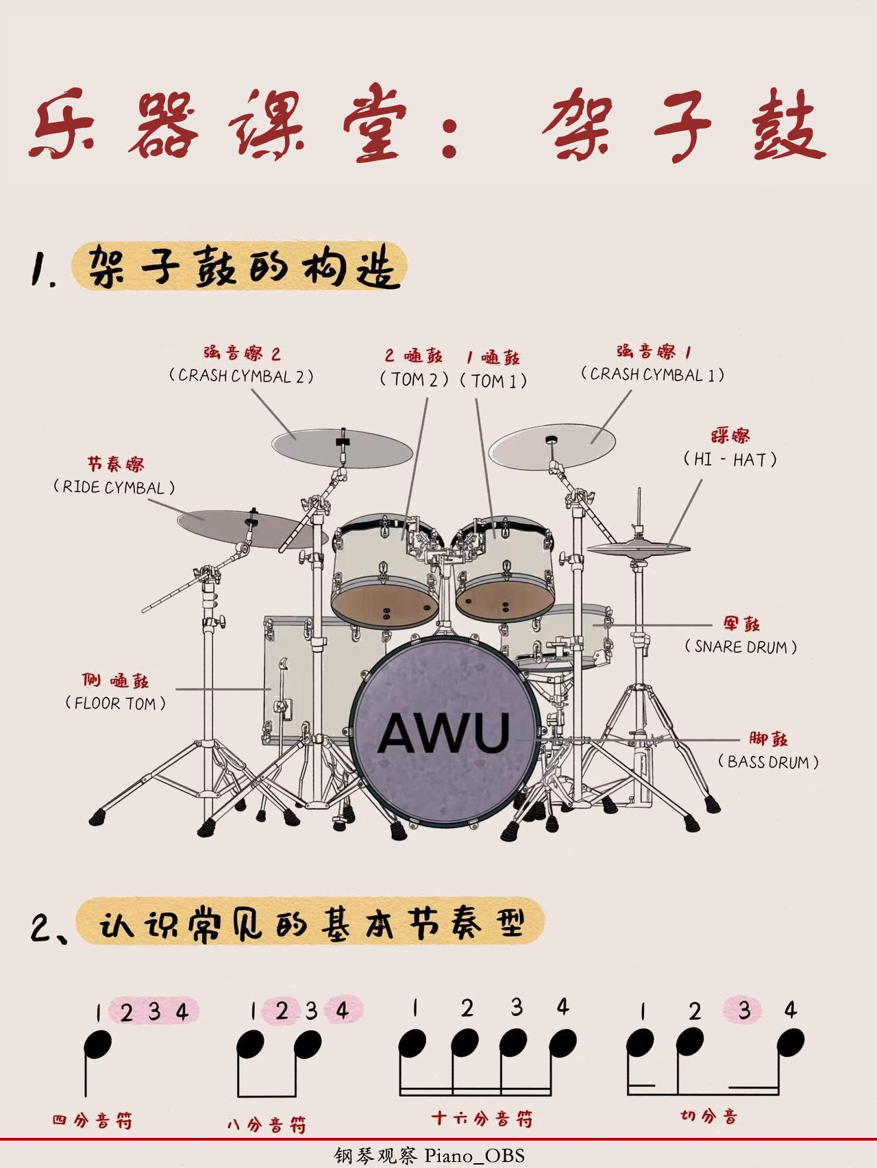 架子鼓形成于20世纪40年代,它包含着各种不同类型、不同音色的手击乐器和脚击乐器。手击乐器有小鼓、嗵鼓、吊镲等,脚击乐器有大鼓、踩镲。在此基础上,根据演奏的需要、可随时增减附加打击乐器。在乐队中鼓手掌握着乐曲的速度和节奏等重要环节,尤其是在爵士乐中,鼓手特别需要与其他乐手保持默契的合作状态。