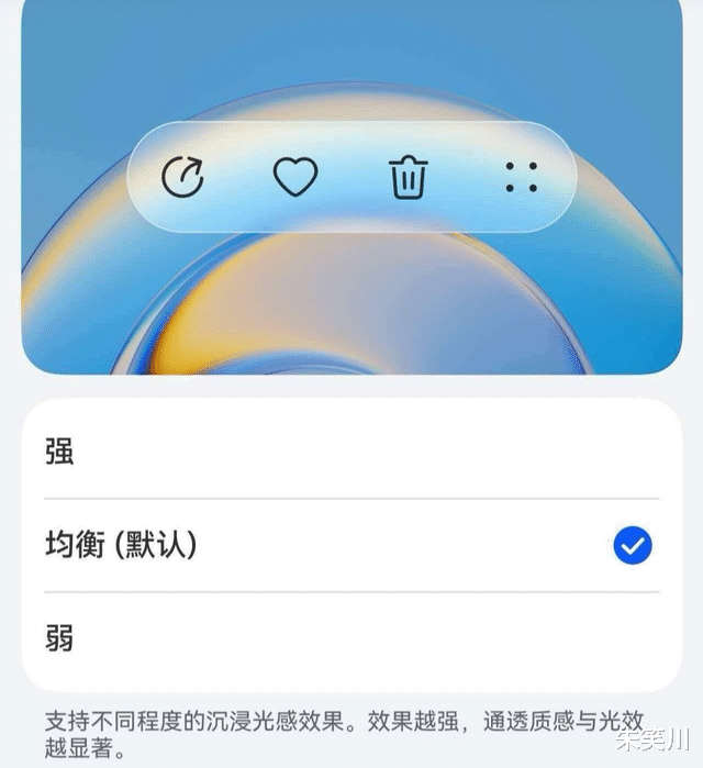 华为的跟进,从来不是简单的 “抄作业”。今年 3 月鸿蒙 6.0 推送的沉浸光感视效 2.0,直接把液态玻璃的核心体验落地到了系统层面,锁屏、桌面、控制中心、通知中心全场景覆盖,更难得的是做了本土化的适配优化 —— 不仅给新旗舰拉满了光影折射的通透质感,还专门做了强、均衡、弱三档可调,连 Mate 60 这样发布近三年的老机型,都能通过档位调节获得流畅不卡顿的玻璃视效,甚至连意外出现的 “水感 Bug”,都被用户喊话官方保留,成了极具特色的加分项。
